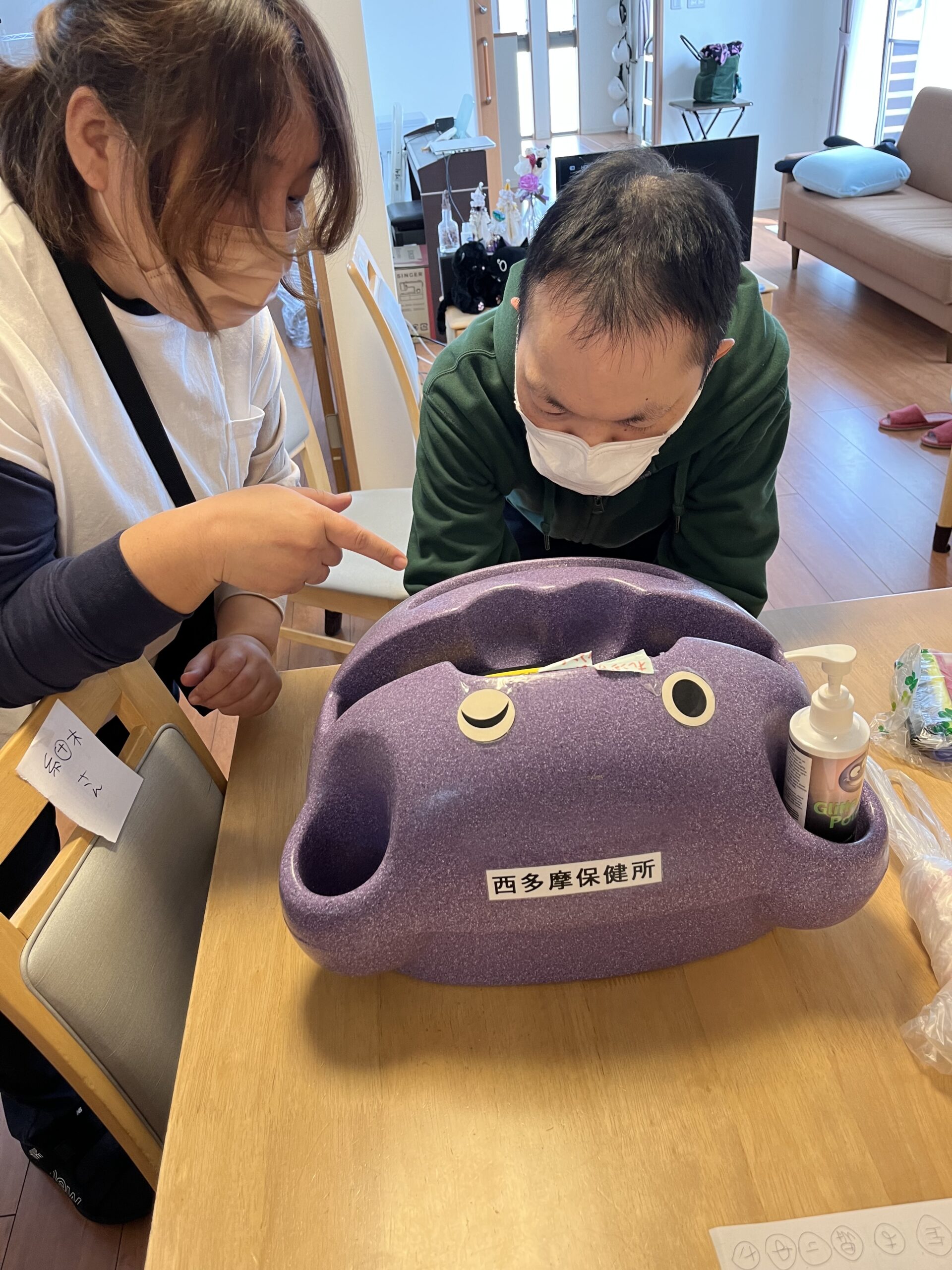 手洗いの歌の動画視聴や、LEDライトで洗い残しがどれだけあるか・・・を参加者全員で学んでいます。